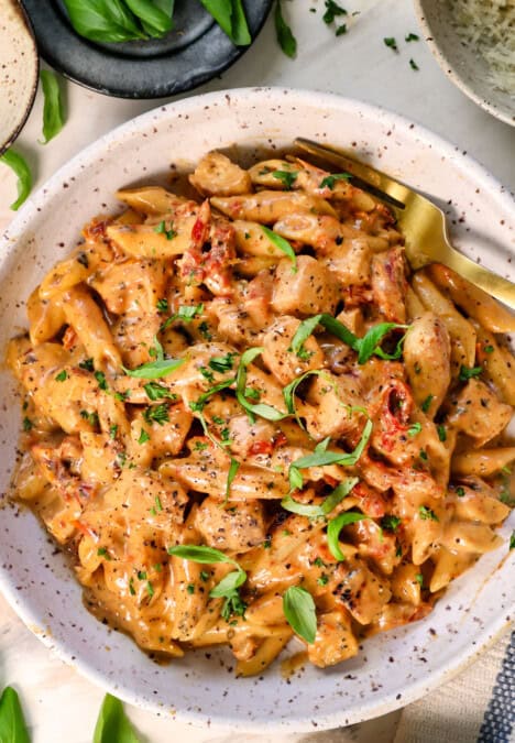 Don’t worry when you hear the word “marinate.” It is just a 15-minute marinade – more like a “wet rub” – made by whisking the homemade spice mix, olive oil and vinegar together. We massage it all over the chicken to achieve even more tender and flavorful chicken. You can marinate the chicken for as little as 15 minutes or up to 8 hours in the refrigerator.