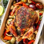 This roast chicken is supremely juicy, tender, and flavorful thanks to herb butter smothered under and over the skin! The chicken is roasted to golden perfection with the option of potatoes and carrots for a complete meal-in-one. Bonus: Learn how to make quick pan gravy from the sensational drippings!